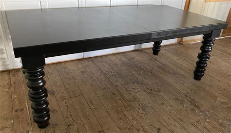 A black turned leg dining table is a type of dining table that features legs that have been turned on a lathe to create a decorative and elegant shape. These legs are typically made from wood and are finished with a black stain or paint to give them a sleek and stylish look.