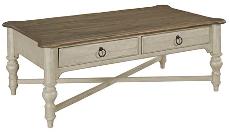 Aside from its stunning design, the Kincaid Weatherford Coffee Table is also highly functional. It has two spacious drawers that provide ample storage space for your remote control, magazines, and other small items. The drawers have metal handles that add to the overall look of the table. There is also a lower shelf that provides additional storage space for books or decorative items.